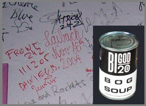 When the band was signing our wall, i forgot I had from Teletunes a Promo can of BiGod 20 "Bog soup"  Jean-Luc De Me was happy to serve up an autograph.  There is Laibach's signing on the wall too, forgot to post that one :)