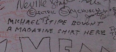 May 1995, REM’s Michael Stipe dropped by the store two days in a row while his band was headlining at Fiddler’s Green. Lisa at the shop called to tell me he was in, I was like "Sweet, ask him to sign the wall!!" but she didn't want to bother him and he left. Then we got lucky, he came back the next day. She asked him to sign the wall and he said 'no problem but where?' There was nothing on the wall yet.. she just said over by the front door, so Stipe wrote on the wall: “Michael Stipe bought a magazine and a shirt.” and there is was.. it was started! - and the rest is history!!