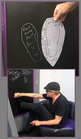 A 'foot note' - a pair of signatures 19 years apart. Â David J signed our wall back in 1996, this is one of the few autographs we were able to keep from the old store. Â I showed it to him during his visit and he signed our new wall with the matching left foot. Â We have it framed in the new shop.